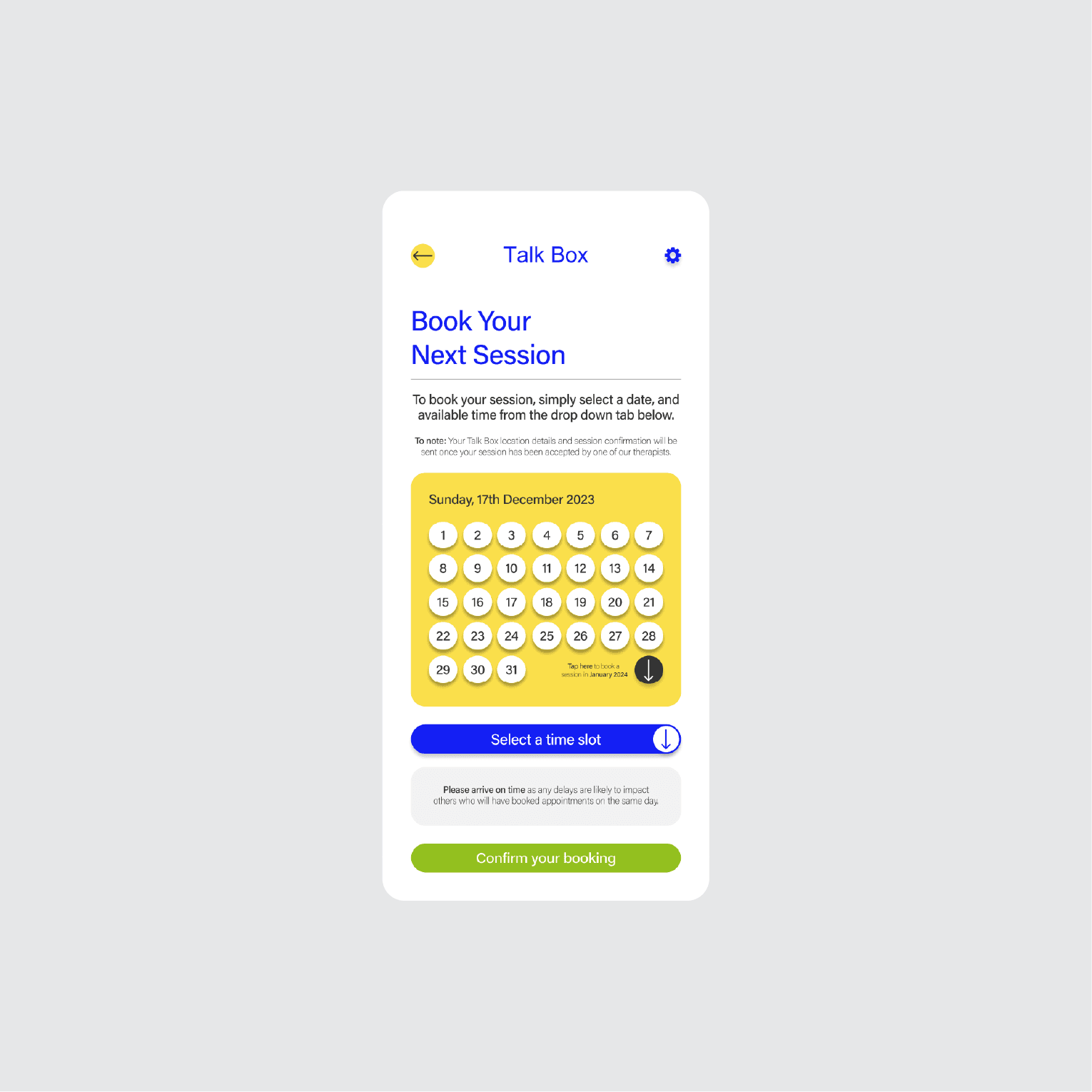 Built an interactive prototype to simulate the therapy booking experience (Figma).